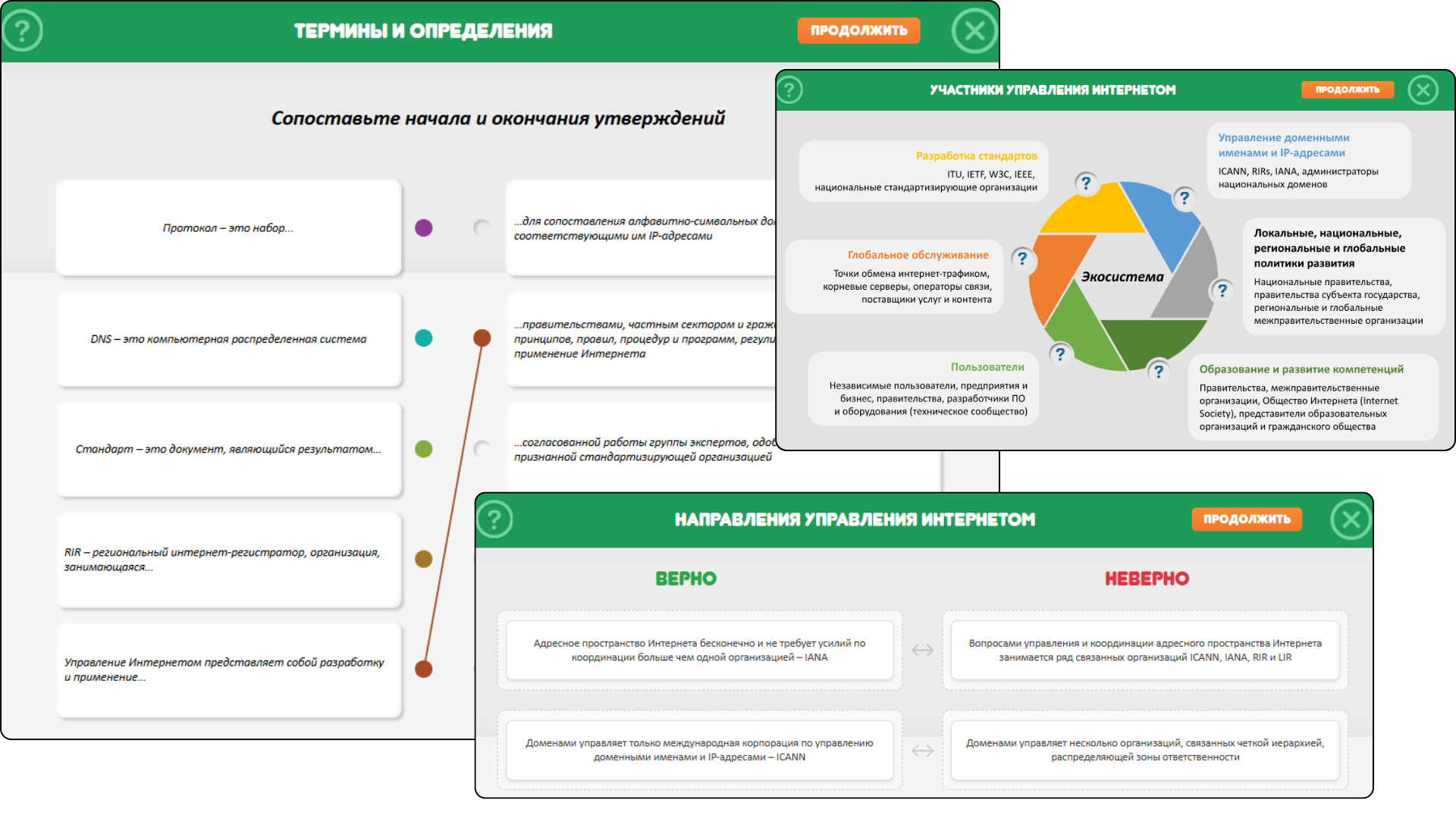 Так, полностью переработан и приведен к уровню «для продвинутых» модуль «Управление интернетом». В роли редактора выступила Анастасия Савельева, руководитель Летней школы по управлению интернетом Координационного центра доменов .RU/.РФ, старший преподаватель кафедры инфокоммуникационных систем Санкт-Петербургского государственного университета телекоммуникаций им. проф. М.А. Бонч-Бруевича. Собирая пазл, выполняя задание на сопоставление, решая тест и разгадывая кроссворд, можно узнать о заинтересованных сторонах и направлениях в области управления интернетом, сетевой архитектуре и многих интересных фактах, связанных с этим важным процессом.