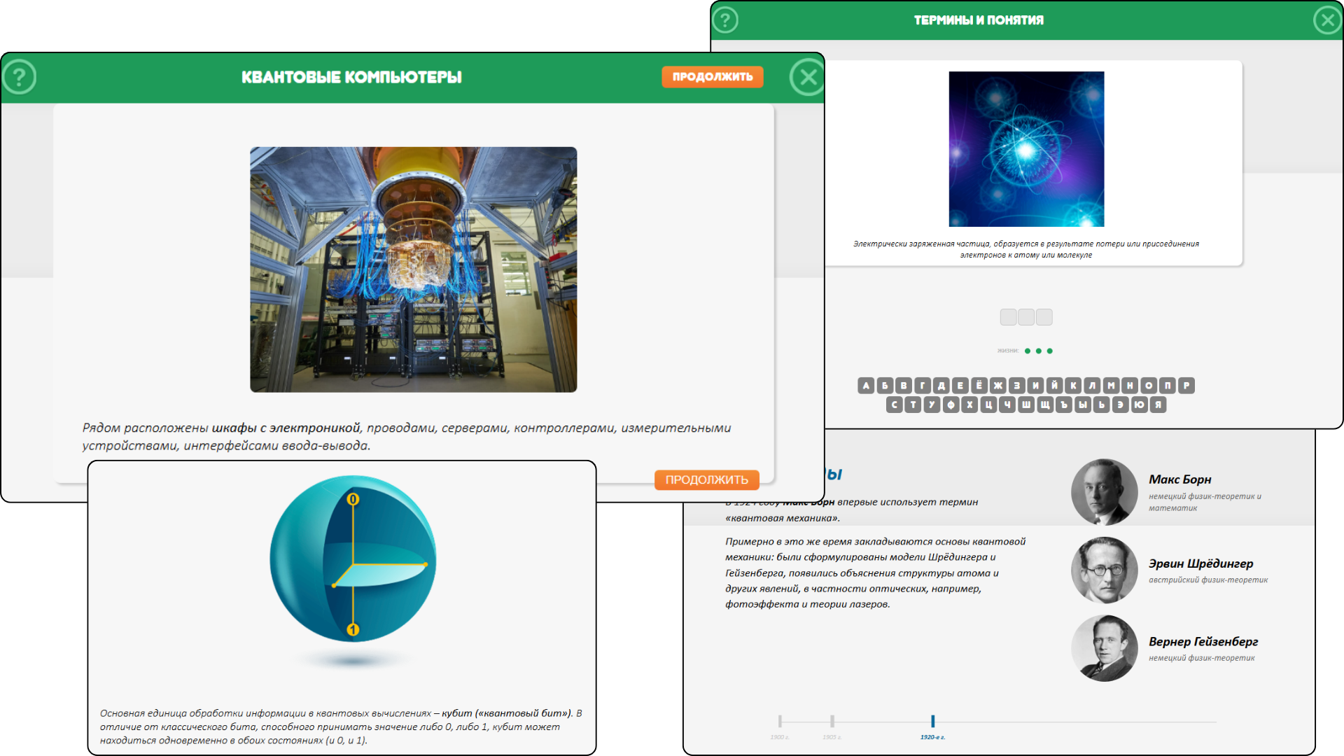 Ещё «Знания» пополнились новым образовательным модулем «Квантовый мир». Он посвящен квантовым технологиям и один из самых сложных в теоретической части, т.к. требует наличия не только прикладных знаний, но и развитого пространственного мышления. Выполняя задания этого блока, можно узнать об истории квантовых технологий и вкладе ученых в их развитие, подробности квантовых вычислений, коммуникаций и создания высокоточных измерительных приборов; также задания помогут рассмотреть квантовый компьютер и осознать, какие объемы информации он способен обработать за секунды.
